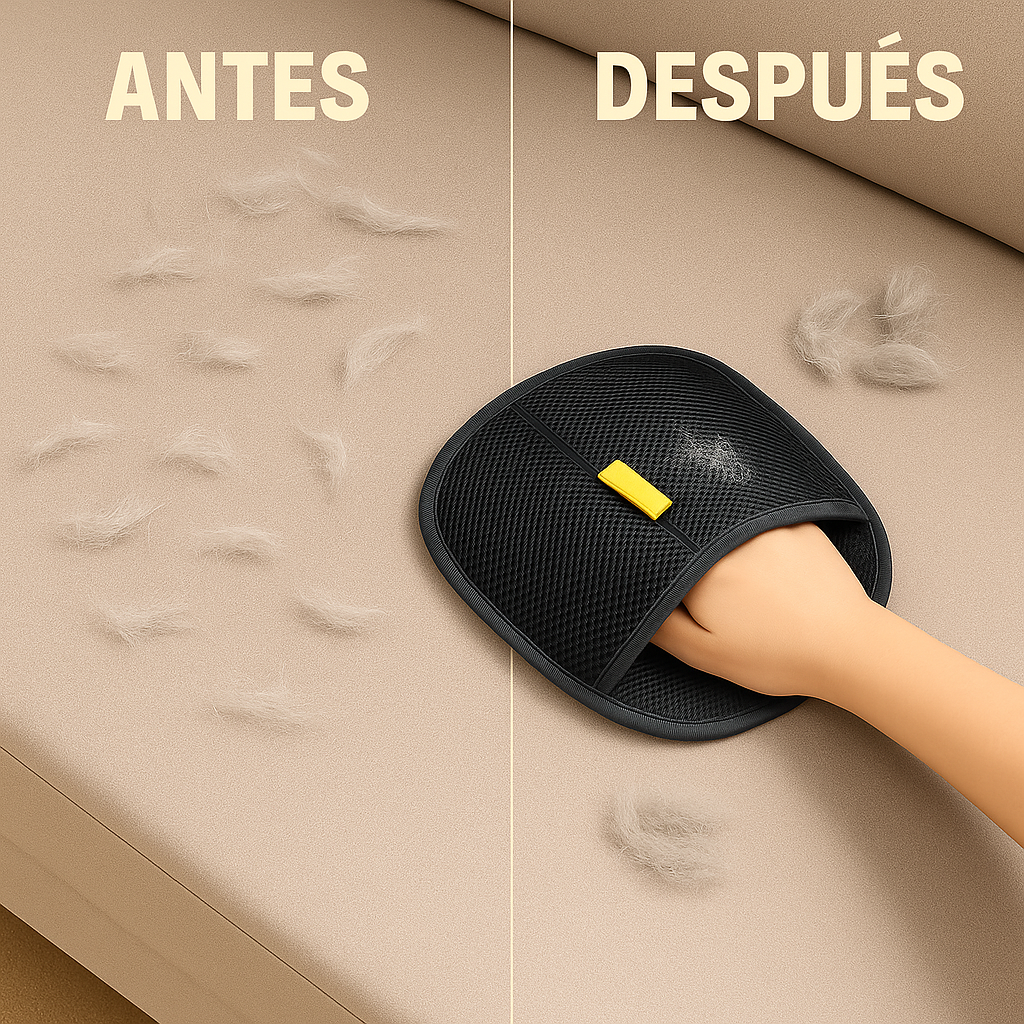 Olvídate de los rodillos pegajosos: con PetGlove™, verás cómo los pelos desaparecen de sofás, camas y ropa sin esfuerzo.